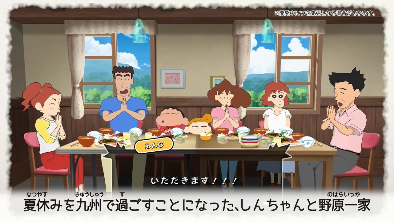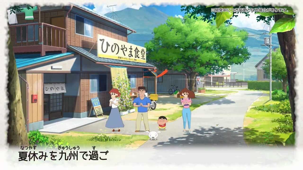 在本作中,玩家将扮演主角野原新之助(蜡笔小新),前往一个怀旧而又平凡的日本小镇,并在这里度过自己的暑假。场景内容丰富,除了钓鱼、捉虫、浇花等活动外,玩家还能与小镇中其他居民交谈以获得额外的任务或活动项目。